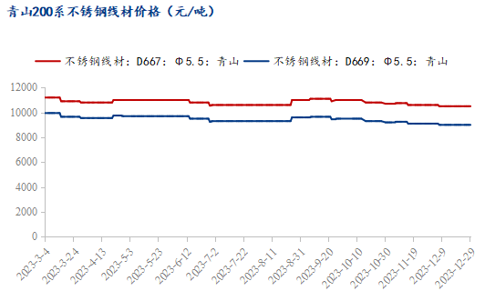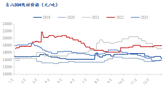 2023年不锈钢线材市场价格重心持续下移,在原料端镍铁、钼铁等价格走势影响下,线材价格一路跟跌,2-3月份跌幅最为明显,4月-5月份受到旺季预期影响,成交逐步回暖,但贸易商补货相对比较谨慎,在此期间市场去库加速,钢厂产量逐步恢复增加,供需双旺之下引发的小幅度反弹行情,6-7月份受到淡季预期压制以及旺季需求释放后,价格再次回落,但跌幅相较于2-3月份有放缓,整体价格震荡偏弱运行,8-9月份,下游采买心态有所回暖,下游需求阶段性补货,进入低四季度后,政策力度不断加码,以及国际宏观局面变化下,线材抗跌性加强,虽相关联品种走弱,但此阶段价格相对平稳坚挺。展望2024年,不锈钢线材价格又将如何演绎?