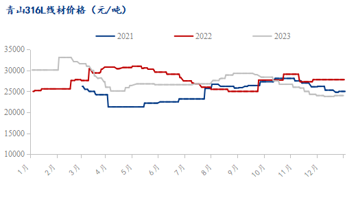 300系:回顾全年价格走势,304材质2023年1月至2月下旬价格呈现缓慢上升趋势,并于2月5日涨至最高价18500元/吨,之后价格不断走跌,于12月6日跌至最低价13700元/吨,8-9月份先强后弱运行,9月中旬完全进入下行趋势。316L材质价格趋势与304材质价格趋势相似,于2月3日涨至最高价33100元/吨,于12月7日跌至最低价23800元/吨。相较于不锈钢相关联其他品种而言,线材价格整体跌幅相对较慢,与2022年上半年的价格走势完全不同,具体上是,2023年上半年304材质均价在16040元/吨,同比跌幅在11.8%,316L材质均价在27500元/吨,同比跌幅在0.8%,对比去年同期,今年线材价格处于低位。