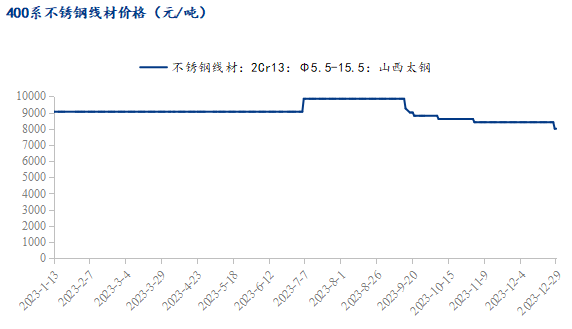 400系:回顾全年价格走势,以山西太钢为例,2Cr13材质2023年1月份至7月份价格基本持稳运行,7月中旬到9月中下旬价格短暂上升后保持稳价,并于7月6日涨至最高价9850元/吨,9月中旬后价格不断下跌,于11月2日跌至最低价8400元/吨。全年整体价格趋势持稳,均价在9060元/吨。