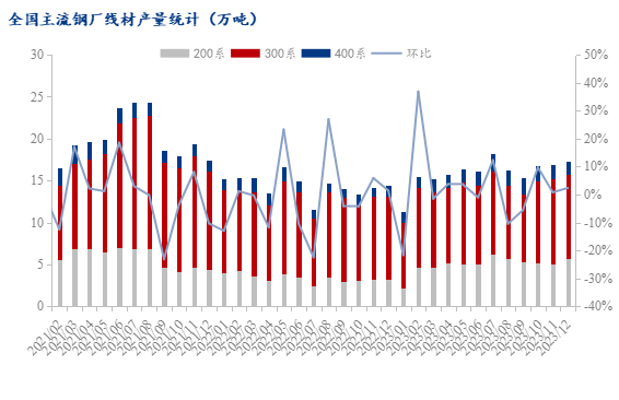 据Mysteel统计,2023年全年不锈钢线材总产量191.21万吨,同比去年增幅在22.1%,其中200系产量总计59.82万吨,同比增幅61.5%;300系产量111.49万吨,同比增幅4.3%;400系产量19.9万吨,同比增幅41.1%,主要体现在200系和400系方面,200系市场年内抗跌性较强,钢厂以及贸易商利润空间尚可,在利润驱动下,钢厂排产计划,铁水倾斜200系以及400系较为明显。